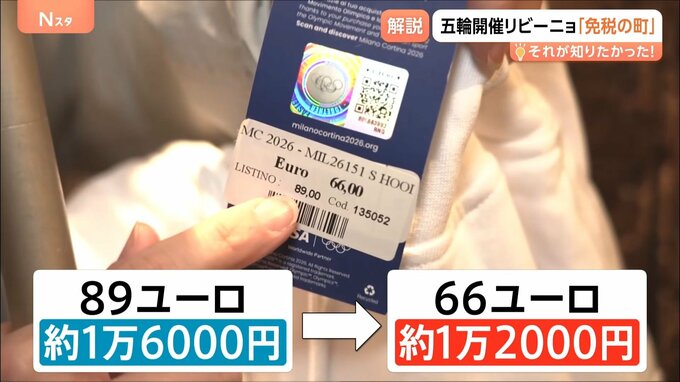 「ミラノや他の場所で買えば89ユーロ(=約1万6000円)ですが、リビーニョで買えば66ユーロ(=約1万2000円)。なんと23ユーロ=4000円くらい違います」