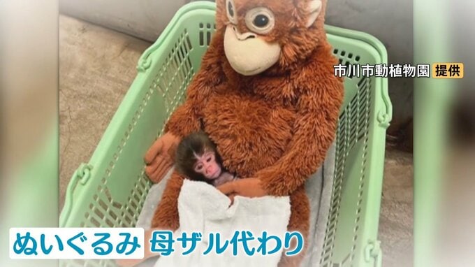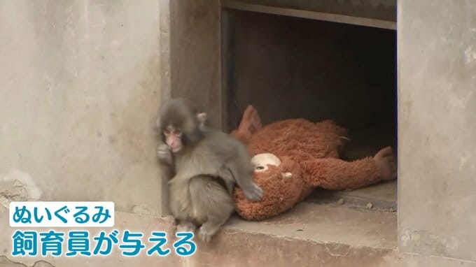 このぬいぐるみは、育児を放棄してしまった母ザルの代わりに飼育員が与えたものです。