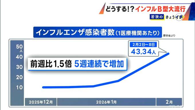 猛威を振るうインフルエンザ。厚労省によると、2月2日~8日の1医療機関あたりの感染者数は、約43.34人で、前の週から約1.5倍と5週連続で増加しています。