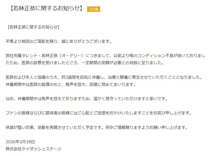 医師および本人と協議のうえ、約3週間を目処に休養し、治療と静養に専念させていただくこととなりました。休養期間中は医師の指導のもと、発声を控え、回復に努めてまいります。