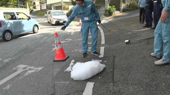先月29日、宜野湾市伊佐の路上で普天間基地と公共下水道につながるマンホールから白い泡があふれ出しました。