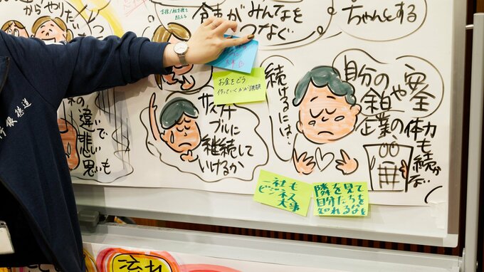 各団体の発表内容は、グラフィックファシリテーションにて同時進行でボードに描き出され、鮮やかなイラストと印象的な言葉の抽出が、参加者の理解と思考を促した。