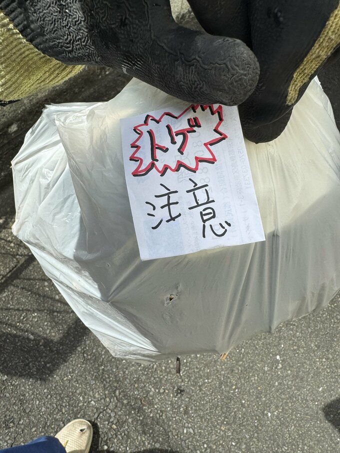 そして『トゲ注意』と注意書きが添えられたゴミ袋の画像をアップし、「丁寧に書いてくれる人もいますが、僕らが見て理解できれば大丈夫です!」と呼びかけました。