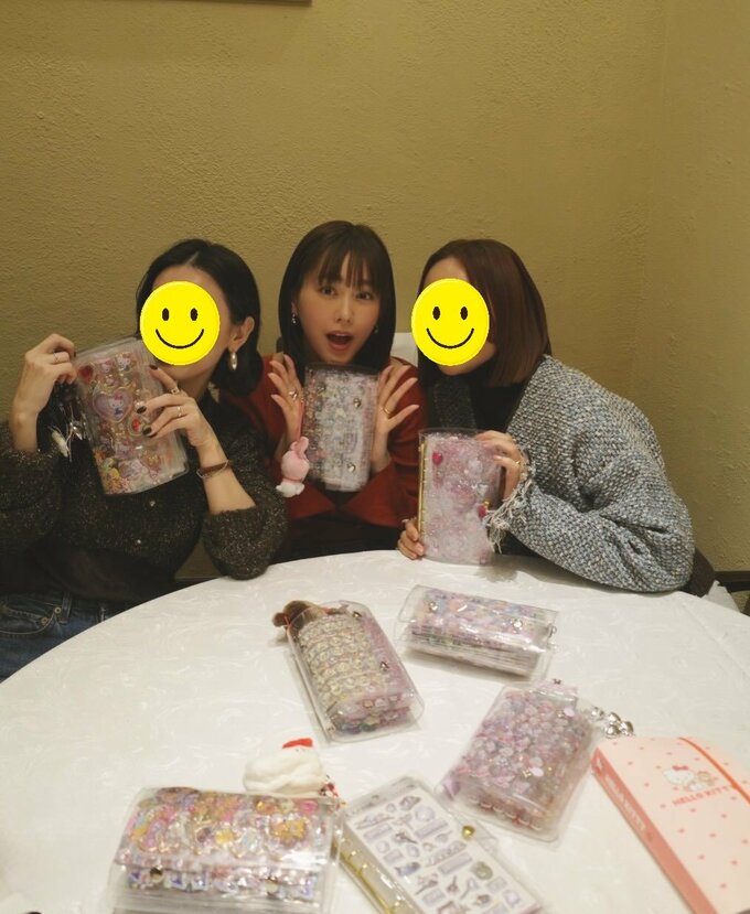 桐谷さんは「がっつり平成女なので、どっぷりシールに沼ってます」と、友人二人に挟まれてシールを集めたフォルダを抱えている3ショット写真を投稿。桐谷さんにシールを勧めた方と、同時期にシール集めを始めた方がいて、計3人で「それぞれのシール帳持ち寄って交換会 可愛すぎた♡」とご満悦の様子です。