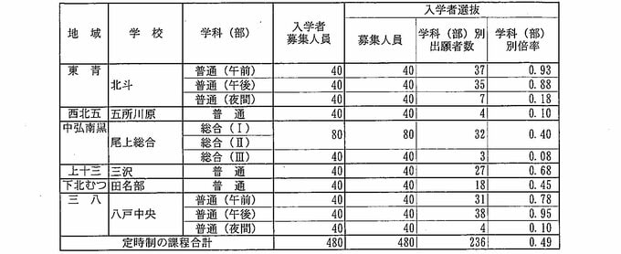 青森県 県立高校入試2026 出願倍率 青森高校1.10倍・八戸高校1.22倍・弘前高校1.17倍 最も高いのは弘前中央・普通科1.31倍 全日制平均0.92倍【全校掲載/学校・学科別倍率 一覧】 青森テレビ 2026年2月18日(水) 15:00 国内 【各地域の出願倍率】 ♦上十三の出願倍率 ♦下北の出願倍率 ♦西北五・中弘南黒の出願倍率 ♦三八の出願倍率 ♦東青の出願倍率 ♦定時制の出願倍率 ♦特別支援学校(高等部)の出願倍率 【記事を最初から読む】