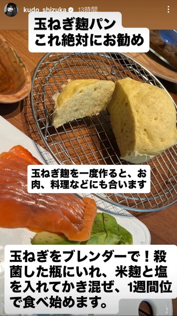 工藤静香さんは「玉ねぎ麹パン これ絶対にお勧め」と綴ると、美味しそうなパンの画像をアップ。