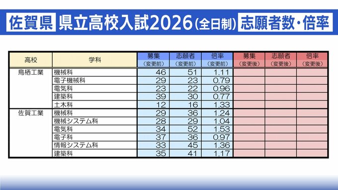 【全ての高校・学科を掲載】佐賀県立高校 2026年一般入試の志願者数・倍率 佐賀西1.22倍・致遠館(理数)1.13倍 (普通)1.39倍・唐津東1.19倍・佐賀北(普通)1.61倍(芸術)1.26倍 RKB毎日放送 2026年2月18日(水) 15:47 国内 鳥栖工業・佐賀工業の志願者数と倍率 ▼佐賀県立高校 2026年一般入試 全校の志願者数・倍率は画像で掲載しています。