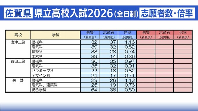 【全ての高校・学科を掲載】佐賀県立高校 2026年一般入試の志願者数・倍率 佐賀西1.22倍・致遠館(理数)1.13倍 (普通)1.39倍・唐津東1.19倍・佐賀北(普通)1.61倍(芸術)1.26倍 RKB毎日放送 2026年2月18日(水) 15:47 国内 唐津工業・有田工業・嬉野の志願者数と倍率 ▼佐賀県立高校 2026年一般入試 全校の志願者数・倍率は画像で掲載しています。