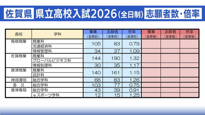 【全ての高校・学科を掲載】佐賀県立高校 2026年一般入試の志願者数・倍率 佐賀西1.22倍・致遠館(理数)1.13倍 (普通)1.39倍・唐津東1.19倍・佐賀北(普通)1.61倍(芸術)1.26倍 RKB毎日放送 2026年2月18日(水) 15:47 国内 鳥栖商業・佐賀商業・唐津商業・神埼清明・多久・唐津青翔の志願者数と倍率 ▼佐賀県立高校 2026年一般入試 全校の志願者数・倍率は画像で掲載しています。