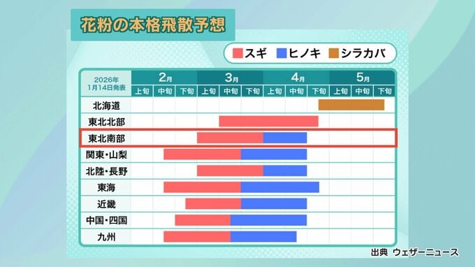 また、県内を含む東北南部でスギ花粉が本格的に飛び始めるのは、3月上旬の予想です。その後、4月上旬から中旬にかけてヒノキ花粉が飛ぶ見込みです。ただ、気温が上がったり、風が強かったりするとシーズン開始からすぐに花粉の量が増える可能性もあるので、今から対策が必要です。