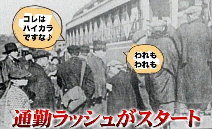 最初は「珍しもの好き」な人が乗り、便利さと定時制が評価され、やがて「通勤は電車で」というのが当たり前のライフスタイルになってきます。じつはその頃からラッシュ時の混雑はあったのです。
