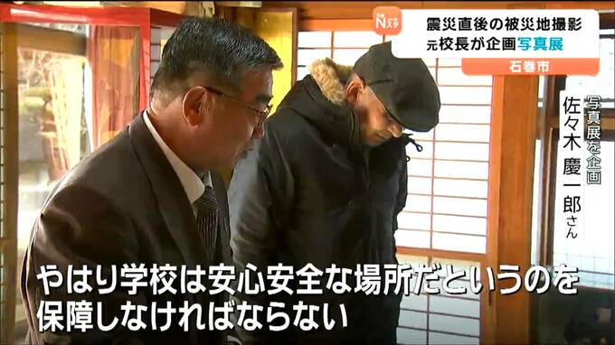 多くの棺が並べられた石巻市内の遺体安置所に、沿岸部の住宅を飲み込む真っ黒な津波。石巻市北村の元女川高校校長、佐々木慶一郎さんが企画した写真展では、自身が撮影した被災地の写真や当時の新聞など、約350点が展示されています。18日は、震災当時、女川町議会の議長を務めていた木村征郎さんが会場に足を運び、事前防災の備えが不十分だった大川小の説明を受けました。