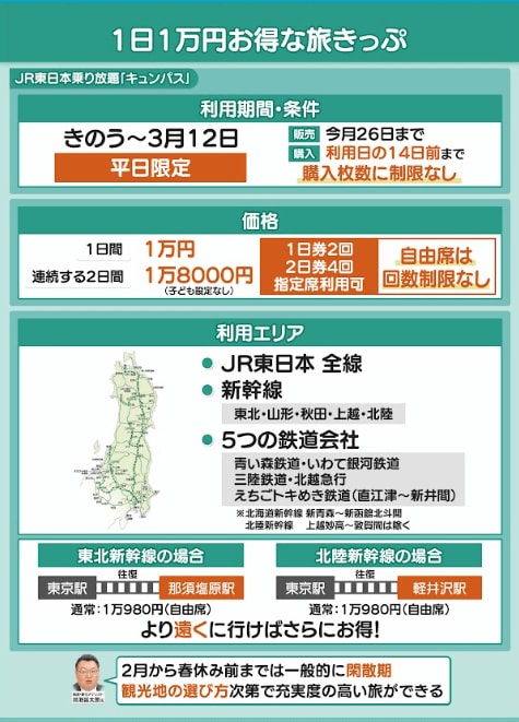 平日限定で、JR東日本・新幹線などが1万円で乗り放題になるキャンペーンです。