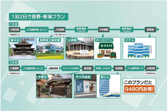 日帰り旅だけでなく、2日間用の「キュンパス」を使えば1泊2日の旅行も楽しめます。