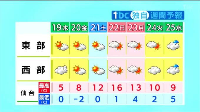 最低気温は氷点下2℃から0℃と、18日朝と同じくらいかやや高いでしょう。最高気温は、4℃前後に留まり、日中も寒さが厳しくなりそうです。