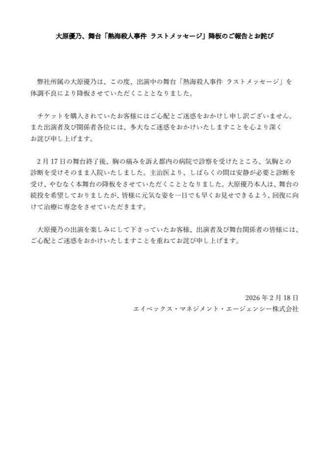 体調不良により、出演中の舞台「熱海殺人事件 ラストメッセージ」を降板することを発表し、所属事務所のエイベックス・マネジメント・エージェンシー株式会社の発表文を投稿しました。