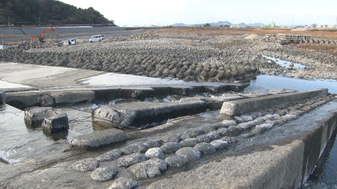堰に設けられた魚の通り道「魚道」は、取材前日の2月17日までは「空」の状態だったといいます。取材した18日は勢いよく水が流れているように見えますが、4年前に同じ堰で撮影された映像と比べると、水量が明らかに少なくなっています。