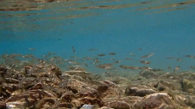 「その辺まで“水の跡”があるでしょう?白くなっているところは全部、水が流れていた跡なんです。普段はその辺までずっと水があるのが当たり前で、今のようにそのまま“川底”を歩けないんです。だから今のこの水量は“ぎりぎりの状態”です」