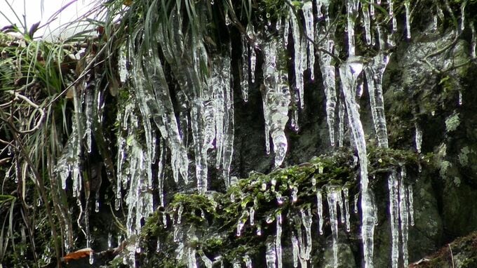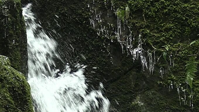 落差20メートルの不動滝では水しぶきや雪解け水が凍り、岩肌に無数のつららが垂れ下がっていました。