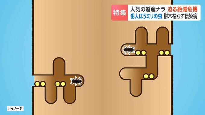 カシナガは「ナラ菌」をもっていて、トンネルを通して菌が樹木全体に蔓延。菌に感染した木の細胞が死ぬことで水の通り道が詰まり、枯れてしまうのです。