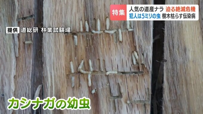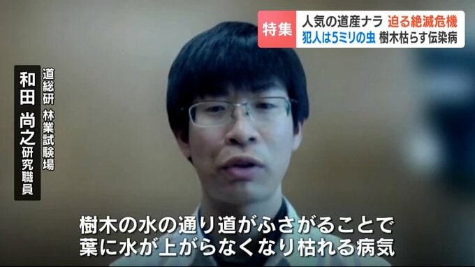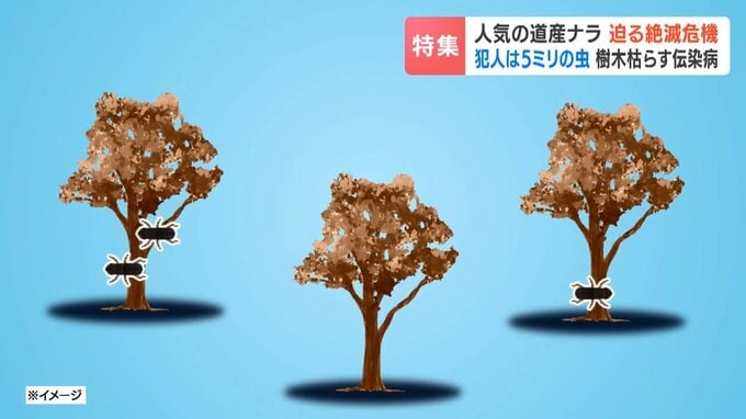 「カシノナガキクイムシがナラの木に穿入(せんにゅう)するときに、病原菌を持ち込み、樹木の水の通り道がふさがることで葉に水が上がらなくなり枯れる病気」
