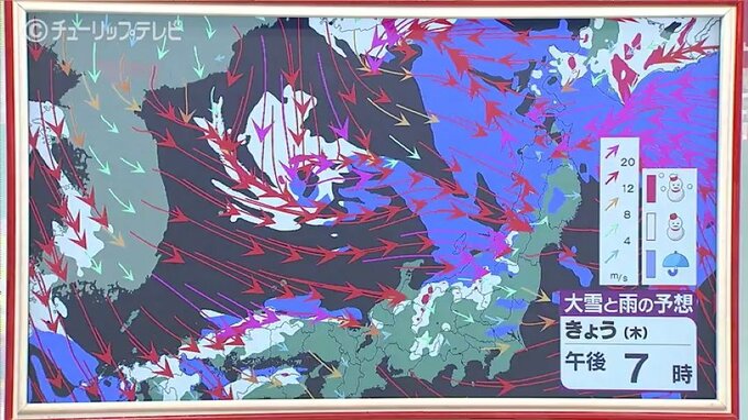 はい。富山県内はこの時間(午後6時20分)もう雪に変わり始めています。22日夜のうちには雪ですね。23日朝はしっかり積もっていると見込まれます。ではまず雪と風から詳しくみていきましょう。