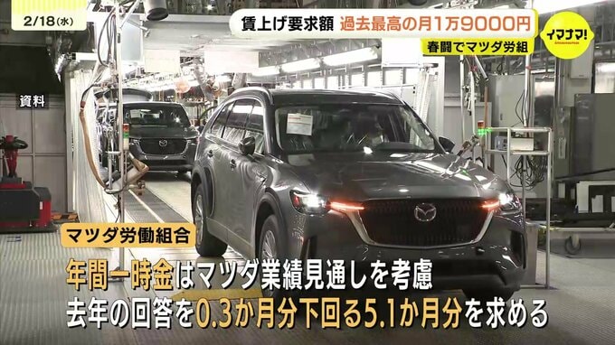 マツダ労働組合によりますとベア=ベースアップに相当する賃金改善と定期昇給分を合わせた、1人あたり平均で月1万9000円の賃上げを求めています。賃金改善の要求は5年連続で、去年の要求額を1000円上回り過去最高となっています。一方、ボーナスにあたる年間一時金については、マツダの業績見通しが、前年を下回ることを考慮し、去年の回答を0.3か月分下回る5.1か月分を求めています。