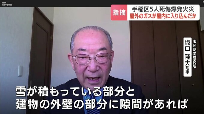 東京消防庁で長年、火災予防業務に携わり、防火や防災管理に詳しい坂口隆夫さんは、住宅屋外の配管から漏れたガスが屋内に入り込んだ可能性を指摘します。