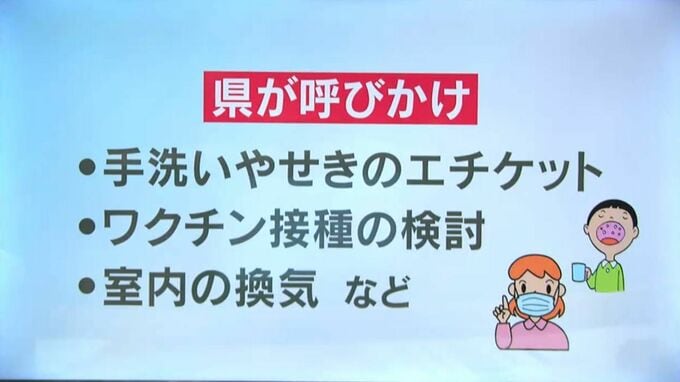 鹿児島県内では「流行発生警報」が発表されていて、県は、▼手洗いやせきのエチケット、▼ワクチン接種の検討、▼室内の換気など基本的な感染対策を呼びかけています。