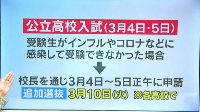 県内の公立高校入試は来月4日と5日に行われますが、県教委によりますと、受験生がインフルエンザやコロナなどに感染して受験できなかった場合、通っている中学校の校長を通じて来月4日~5日正午までに申請すれば、追加選抜として来月10日に試験を受けられるということです。