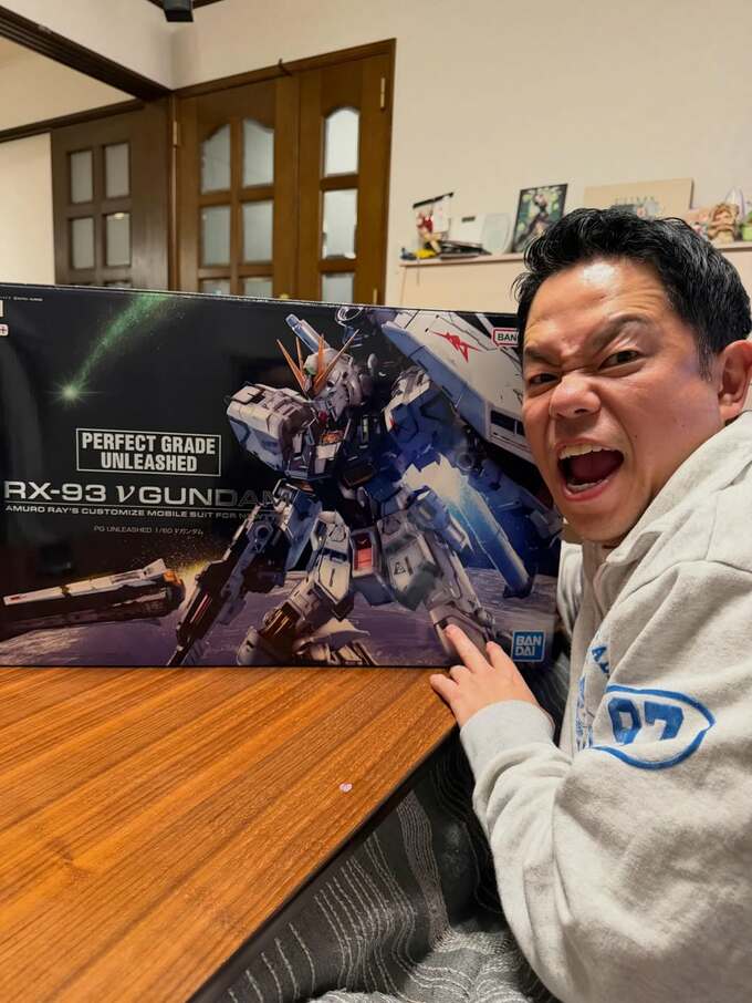 「こんなにもでかいとは!」と津田さんは驚愕の表情。その〝ガンプラ〟とは「PREFECT GRADE UNLEASHED 1/60 νガンダム」(ニュー・ガンダム)。公式サイトによれば「実在するガンダムを建造する体験」を目指して作られたモデルとのことで、外装のみならず、骨格や内部部品まで全てのパーツを〝実在するもの〟として設計。組み立てた後は、アニメ作品の中で躍動するガンダムさながらに様々なポーズを取らせることができるようで、劇中で体高22mと設定されている本体のみで高さ37cm近くにもなる大型モデルです。