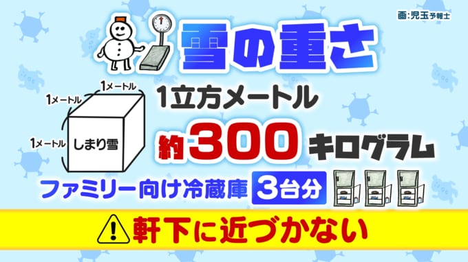 しまり雪の場合、1立方メートルで300キロの重さがあると言われています。これはファミリー向け冷蔵庫3台分に相当する重さで、軒下には不用意に近づかないでください。