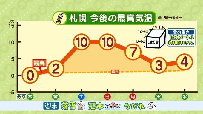 土日は4月並みの気温になるため、落雪事故や雪どけによる道路の冠水、なだれなどに注意して下さい。