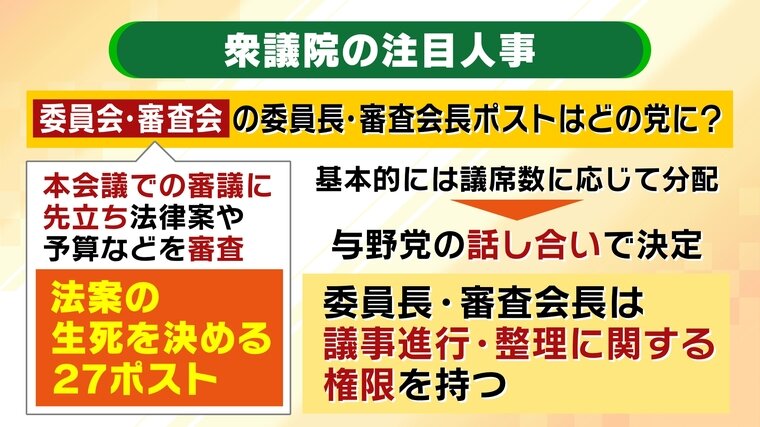 いよいよ本格始動となる高市政権。今注目が集まっているのが、委員会・審議会(本会議での審議に先立ち法律案・予算などを審査)の委員長・審査会長の人事です。基本的には議席数に応じて分配され、与野党の話し合いで決まります。