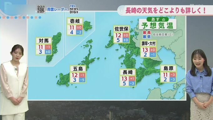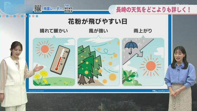 今日の最高気温は平年並みの12.4℃でしたが、これから週末にかけて気温が急上昇し、20度近い暖かさになる見込みです。長崎市の花粉の飛散量も週末に増加し、特に月曜日には一気に「非常に多い」レベルまで上昇する予想となっています。晴れて気温が上がる日、風が強い日、そして雨上がりの日は特に花粉が多く飛びます。日曜日は雨の予報ですが、雨が降っても短い降り方になる可能性があり、実際には花粉が多く飛ぶおそれもあります。