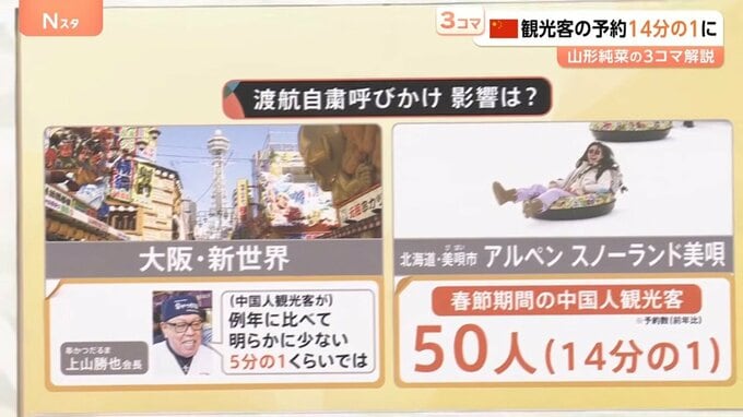 また、スノーアクティビティが楽しめる北海道・美唄市の「アルペン スノーランド美唄」では、2026年の春節期間の中国人観光客は50人と、2025年に比べて14分の1に減少したということです。※予約数(前年比)