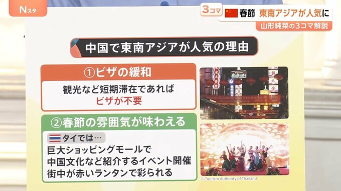 東南アジアが人気の理由として、▼「ビザの緩和」観光など短期滞在であればビザが不要、▼「春節の雰囲気が味わえる」タイやシンガポール、マレーシアなどでは、毎年春節を祝う習慣があるということです。