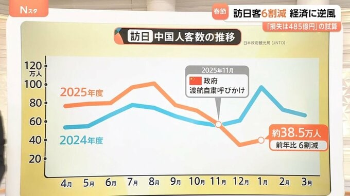 2025年11月に中国政府が日本への渡航自粛を呼びかけてから、右肩下がりの状況です。