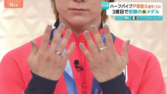 かわいい色が好きなので、かわいい色によくするんですけど、今回は金メダルをとりたいという気持ちもあって、指にちょっと金色を入れてみました。