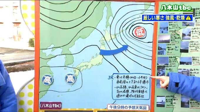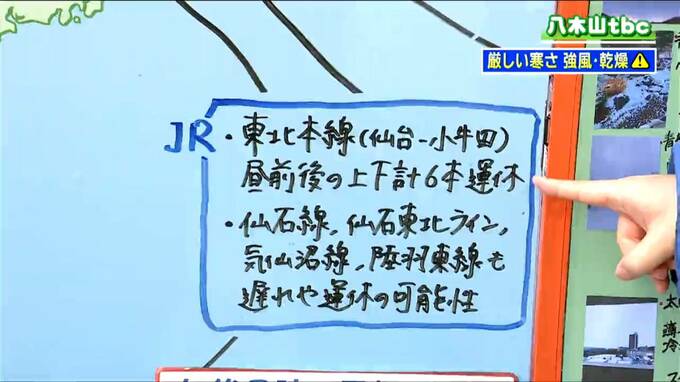 東部では午後9時頃まで強風に注意が必要で、JR東北本線の仙台・小牛田間では昼前後の上下6本の列車が運休を決定しています。そのほか仙石線などの路線でも、日中の時間帯に遅れや運休の可能性があります。