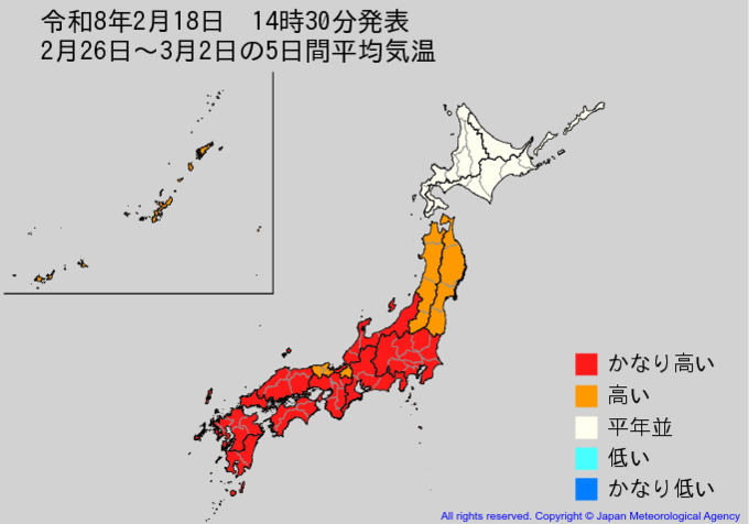 【2週間気温予報】北・東・西日本の向こう2週間の気温は高い日が多い予報 2月21日頃からはかなり高い日もある見込み 全国の天気を地方ごとに 気象庁 テレビユー山形 2026年2月19日(木) 10:41 国内 ■2月26日~3月2日の5日間平均気温(画像) ・8日先から12日先まで5日間平均した日平均気温を表示しています。 ・かなり高い(かなり低い)は、かなり高い(かなり低い)気温となる確率が30%以上のときに表示します。