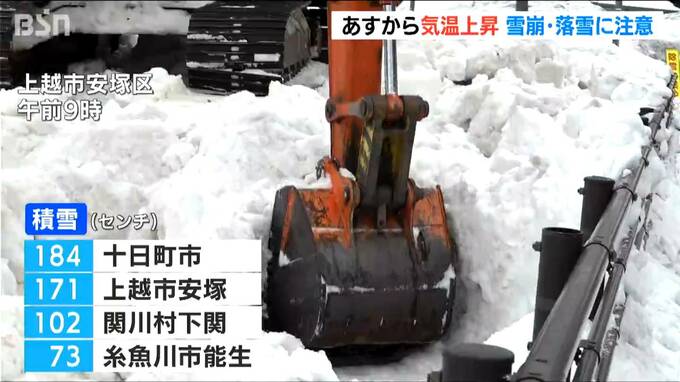 一方、午前11時現在の積雪は十日町市で1メートル84センチ、上越市安塚で1メートル71センチなど、平年以上の雪が積もっている地域があります。