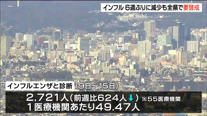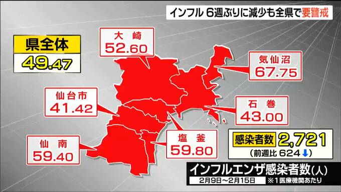 2月15日までに宮城県内でインフルエンザに感染した人の数は、1医療機関あたり49.47人で6週ぶりに減少しました。依然としてすべての保健所で警戒が必要な水準を上回っていて県が注意を呼びかけています。