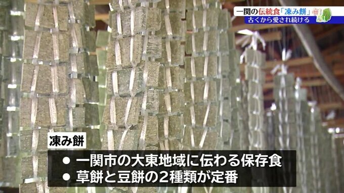 ヨモギを混ぜた草餅と、ピーナッツとゴマを混ぜた豆餅の2種類が定番で、農作業が始まればその合間に食べられたり、子どものおやつとして食べられたりしてきました。作り方は、もち米とうるち米の粉を合わせついた餅をのし状にし、一度固めたものを氷点下の夜に切り分けて干していきます。