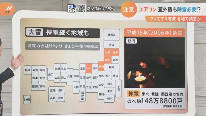なるべく早め早めに準備、そして除雪が求められるわけですが停電が続く地域もあります。(各電力会社HPより 22日午後4時時点)