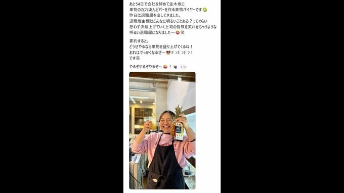 “あと54日”の投稿「思わず決裁上げていく上司の皆様を笑わせちゃうような明るい退職届になりました 要約すると、どうせやるなら果物を盛り上げてくるね! おれはでっかくなるぜ〜ポンポンポン! です笑 やるぞやるぞやるぞ〜!」