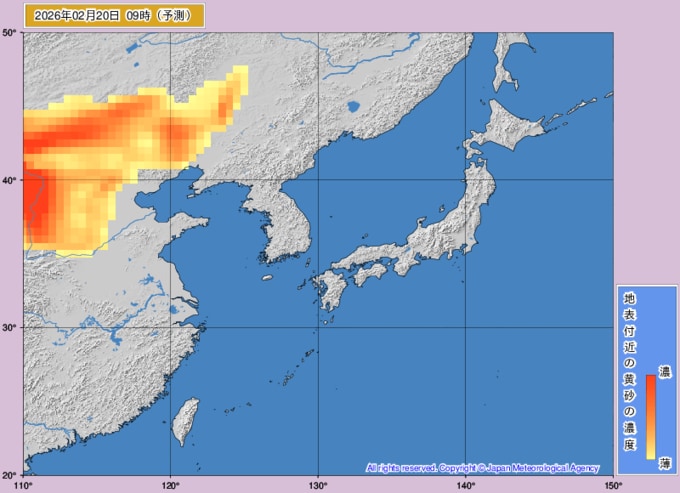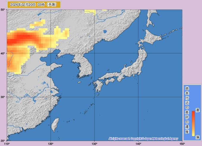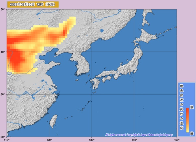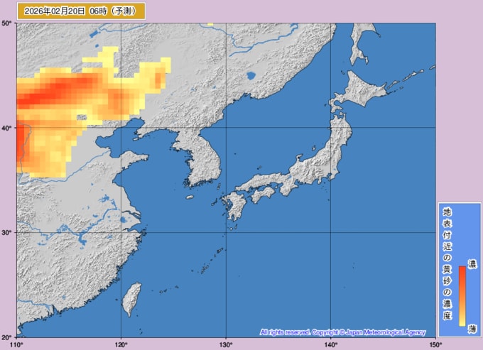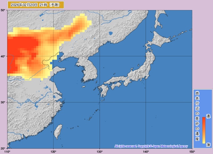 【黄砂情報】週末22日(日)に高濃度の黄砂が西日本に飛来の可能性が… 九州・中国・四国がオレンジ色に 大雪の次は黄砂か…【黄砂の最新予想シミュレーション・気象庁の黄砂解析予測図あり】 青森テレビ 2026年2月19日(木) 14:45 国内 ♦黄砂解析予測図 ♦黄砂の予想シミュレーション(2月19日・20日・21日・22日) ♦記事を最初から読む