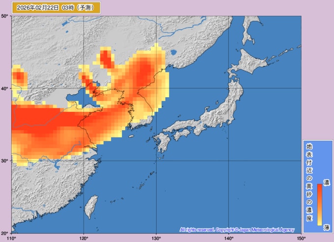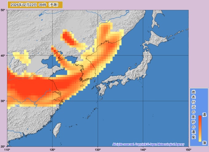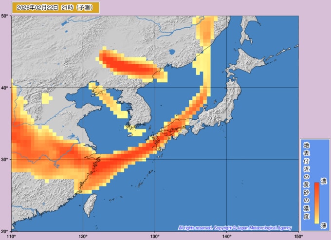 【黄砂情報】週末22日(日)に高濃度の黄砂が西日本に飛来の可能性が… 九州・中国・四国がオレンジ色に 大雪の次は黄砂か…【黄砂の最新予想シミュレーション・気象庁の黄砂解析予測図あり】 青森テレビ 2026年2月19日(木) 14:45 国内 ♦黄砂解析予測図 ♦黄砂の予想シミュレーション(2月19日・20日・21日・22日) ♦記事を最初から読む