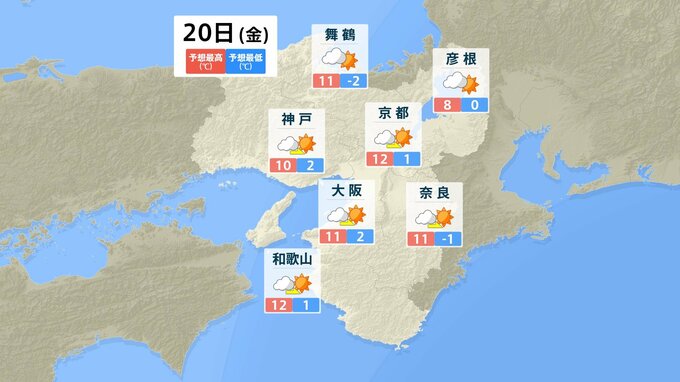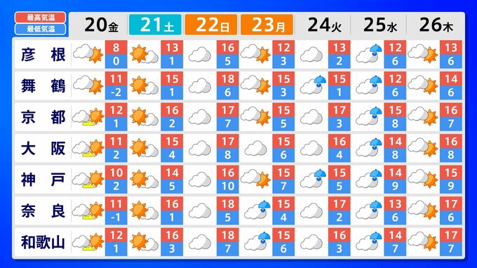 近畿地方の向こう2週間の気温は、暖かい空気に覆われやすいため高い日が多く、2月22日頃と25日頃からはかなり高くなる見込みです。