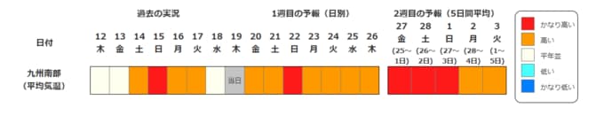 九州南部・奄美地方の向こう2週間の気温は、暖かい空気に覆われやすいため高い日が多く、2月22日頃と25日頃からはかなり高くなる見込みです。農作物の管理等に注意してください。また、今後の気象情報等に留意してください。